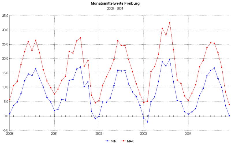 Freiburg deutlich milder (fast um 3 Grad) als im Vergleich die Sommer